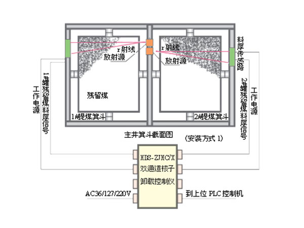 系統(tǒng)結(jié)構(gòu)示意圖 系統(tǒng)設(shè)備組成由帶輻射輸出器、屏蔽罐的放射源;射線探測器和固定支架等構(gòu)成殘留煤厚信號采集部分,由AC127V電源和本安24位單片機等構(gòu)成控制主機,由本安固態(tài)繼電器版、 接線箱等構(gòu)成料后信號輸出、輸出控制部分。其中放射源經(jīng)國家環(huán)保部門檢測,符《GB4792-84》安全標(biāo)準(zhǔn),不會對人體產(chǎn)生損傷,請用戶放心!系統(tǒng)工作原理簡述放射源輸出的γ射線穿透機斗鋼板和機斗內(nèi)卸載后殘留煤,被射線探測器接收,轉(zhuǎn)換成電信號給控制主機。射線穿透鋼板和殘留煤層時要被部分吸收,被吸收的量與殘留煤層的厚度成一定的對應(yīng)關(guān)系。探測器輸出的電信號強度與殘留煤層的厚度具有一一對應(yīng)關(guān)系。控制儀主機通過檢測電信號的強度按一定的數(shù)學(xué)模型、公式,就可得出被測截面卸載殘留煤的厚度,并按設(shè)置上、下限值進行遠(yuǎn)傳報警輸出。實用性及功能實現(xiàn)◇ 該系統(tǒng)可對主井箕斗卸載進行有效安全控制,以免箕斗重載下放或二次裝載的事故發(fā)生。◇ 控制主機可檢測箕斗被測載面卸載殘留煤的厚度值,按預(yù)設(shè)的上、下限報警值進行報警。◇ 給出上位主機PLC的殘留煤厚度報警值,為經(jīng)繼電器隔離的干接點信號(常開或常閉)。